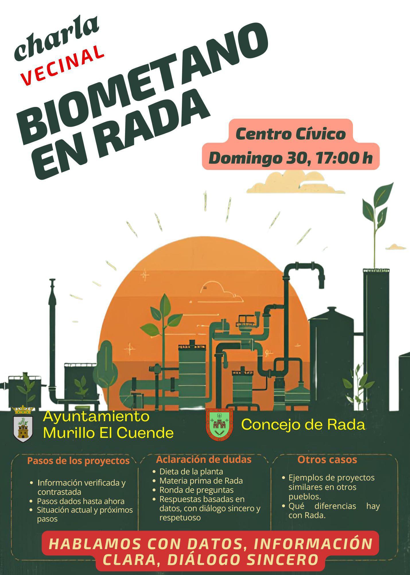 El Ayuntamiento de Murillo el Cuende y el Concejo de Rada organizan una charla informativa dirigida a todos los vecinos para explicar con transparencia el proyecto de biometano previsto en la localidad. El encuentro tendrá lugar en el Centro Cívico el domingo 30 a las 17:00 h.